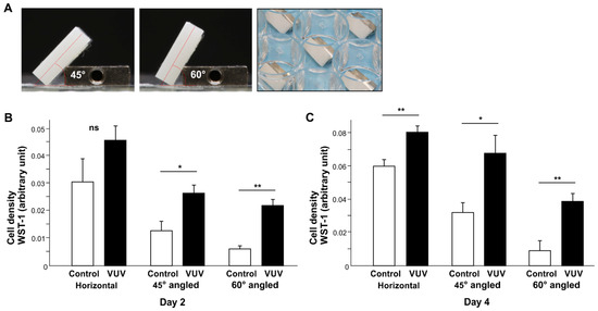 Fibroblast attachment and growth on zirconia specimens under challenging conditions. (A) Photographs of zirconia specimens placed in a well of a polystyrene culture dish at 45° and 60°. Cell density on zirconia specimens evaluated via the WST-1 assay on days 2 (B) and 4 (C). * p < 0.05, ** p < 0.01, statistically different between the control and VUV-treated groups. ns: not significant.