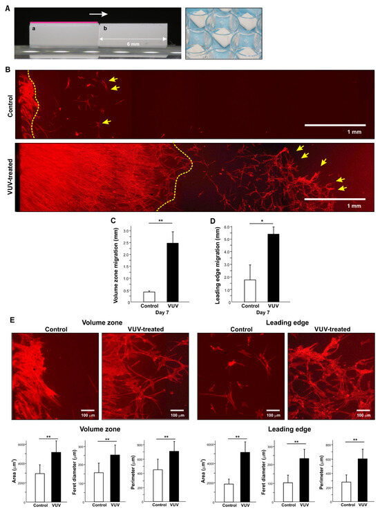 Transmigration of fibroblasts across specimens. (A) Culture setting with two zirconia specimens placed side-by-side. Fibroblasts were grown to confluency in advance on the first specimen (red line on specimen a), and then a new specimen with or without VUV treatment (specimen b) was placed next to the first specimen to allow for transmigration from specimen a to b. The photograph shows the two juxtaposed specimens (right panel). Note the 150 µm gap between specimens. (B) Representative fluorescent microscopy images of milled zirconia specimens with or without VUV treatment showing significant differences in the extent of cellular migration across specimens. Migration was initiated from the left side of the images. The yellow dotted line denotes the volume zone of fibroblast migration. Yellow arrows denote the cluster or colony of fibroblasts forming the leading edge of migration. (C) Maximum migration was defined as the extent of migration by fibroblasts at the leading edge. (D) Volume-zone migration was defined as the extent of migration formed by confluent fibroblasts. (E) Magnified microscopic images from the volume zone and leading edge of fibroblast migration on control and VUV-treated zirconia. Cytomorphometry results are also shown. * p < 0.05, ** p < 0.01, statistically different between the control and VUV-treated groups.