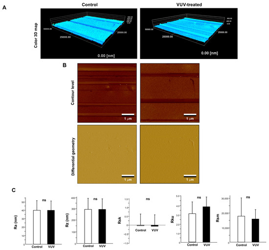 Surface topography of glazed specimens. Three-dimensional color maps (A) and contour level and differential geometry two-dimensional (B) images of glazed specimens via AFM. (C) Histograms of surface roughness parameters calculated via AFM. ns: no significant difference between the control and VUV-treated groups.