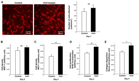 Fibroblast behavior and function on glazed specimens with or without VUV treatment. (A) The number of fibroblasts attaching to specimens during the first day of culture. Representative fluorescence microscopic images and the number of attached cells counted on the images are shown. Cell density evaluated via the WST-1 assay on days 2 (B) and 4 (C). (D) Cell proliferation evaluated by BrdU incorporation into DNA on day 4. (E) Collagen deposition evaluated on day 4 and the measured metrics. * p < 0.05, ** p < 0.01, statistically different between the control and VUV-treated groups. ns: not significant.