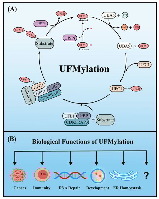 The enzyme cascade of UFMylation (A) and five key biological functions of UFMylation (B).