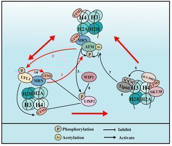 UFMylation of MRE11 and H4 promotes ATM activation (for the purposes of the diagram, MRE11 is abbreviated to MRN complex). (1) Upon DNA damage, UFL1 is recruited to chromatin via MRE11 to UFMylate MRE11, which promotes the formation and recruitment of the MRE11-RAD50-NBS1 (MRN) complex. (2) UFMylated MRE11, together with RAD50 and NBS1, activates ATM. (3) Activated ATM further phosphorylates UFL1 and UfSP2, which promotes UFL1 recruitment, while inhibiting UfSP2 recruitment. (4) As a positive feedback loop, phosphorylated UFL1 further enhances MRE11 UFMylation and UFMylates H4. (5) UFMylated H4 can be recognized by the UFMylation reader serine/threonine kinase 38 (STK38), which is critical for the subsequent recruitment of the methyltransferase SUV39H1. (6) SUV39H1 trimethylates lysine 9 of histone H3 (H3K9me3), which recruits Tip60. (7) Tip60 acetylates ataxia telangiectasia mutated (ATM) and promotes ATM activation. (8) Lastly, the phosphatase WIP1 de-phosphorylates UfSP2 and reverses ATM activation. Red arrows indicate the two positive feedback loops.