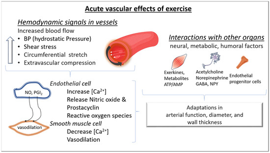 Accelerated biological vascular ageing (early vascular ageing) leads to early target organ damage and subsequently to diseases, such as atherosclerosis, chronic kidney disease, degenerative brain disease, and retinopathy [1]. The prevalence of early vascular ageing in a population, i.e., defined as aortic pulse wave velocity >90th percentile, can be as high as 37% [2], which is why the maintenance of optimal vascular health throughout the entire lifespan is already accepted as a main goal of preventive health care [3]. Regular physical activity and exercise can effectively attenuate the progression of early vascular ageing and should therefore be part of any treatment efforts aiming to improve vascular and general health [4,5]. However, the effectiveness of exercise interventions on biomarkers of vascular health is often limited and not sustainable in the long-term after the discontinuation of exercise training. Targeted exercise, based on objective and subjective individual criteria, carries the potential to overcome these limitations [6,7]. Accordingly, a better understanding of the molecular mechanisms underlying the acute responses and long-term adaptations of the vascular organ to exercise will lead to the design of more effective exercise programs, with better adherence by participants to lifelong training, and potentially will result in a better clinical outcome. Acute hemodynamic adaptations to exercise lead to changes in both endothelial and vascular smooth muscle cell function. Regular exercise training improves nitric oxide (NO) availability and reduces vascular oxidative stress [8]. As a result, endothelial vasodilator and -constrictor responsiveness as well as pulse wave velocity and arterial stiffness are improved [9]. In addition, exercise induces vascular structural adaptations and stimulates angiogenesis and arteriogenesis. This narrative review summarizes current knowledge about the acute molecular responses to exercise within the endothelial and smooth muscle cells of the vascular wall and the associated acute and chronic clinical vascular adaptations. It further addresses how training frequency, intensity, volume, and type influence these processes. Finally, practical recommendations are given for exercise training to maintain and improve vascular health.
