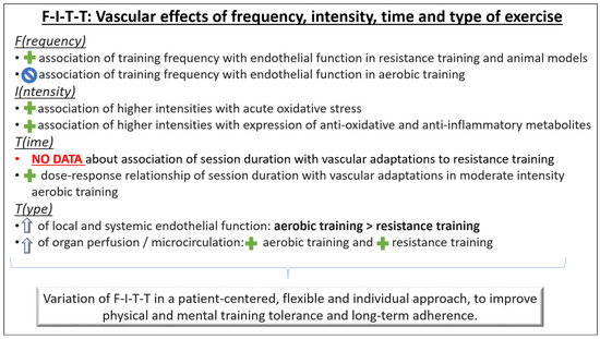 The World Health Organization recommends at least 75 min per week of vigorous physical activity or 150 min of moderate intensity [68]. The relationship between exercise and cardiovascular risk has been described in a curvilinear dose–response pattern [69], and numerous studies have consistently reported beneficial vascular effects of exercise training [5,42,43,44,59,70]. However, these effects depend on frequency, intensity, volume, and modality of the training, and are subject to considerable individual variation [71]. The F(requency)-I(ntensity)-T(ime)-T(ype) principle provides a practical approach to structure and adapt the training program according to the individual’s vascular responses (Figure 3).