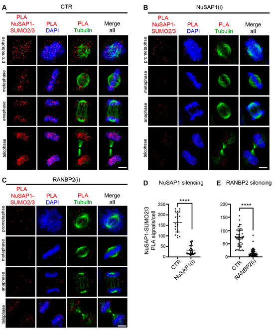The finding that RANBP2 forms PLA products with NuSAP1 and stabilizes NuSAP1 at microtubule plus ends raises the question of whether NuSAP1 might itself be SUMOylated during mitosis. SUMOylation is a highly dynamic modification, which usually concerns a small fraction of target proteins, often with a high turnover and a restricted subcellular localization, which make its detection difficult under physiological conditions. The intramolecular PLA technique has been developed to circumvent these issues and has been successfully employed in several studies to visualize in situ ligation products formed by any given protein and SUMO peptides attached to it, avoiding any alteration of the original ratio of target protein to modifying SUMO peptides, but amplifying their detection [37,38,44,45]. Using this technique, we visualized PLA products formed by endogenous NuSAP1 and SUMO 2/3 peptides. In control cells, PLA signals progressively concentrated at microtubule plus ends and at the interface with chromosomes during progression towards chromosome alignment, particularly evidently in metaphase, when tension is highest (Figure 3A), and eventually to the decondensing chromosomes during anaphase. NuSAP1 silencing prevented the formation of PLA products with SUMO2/3 in all stages (Figure 3B, quantified in Figure 3D): this control indicates that the ligation is specific of NuSAP1 and is not due to SUMO peptide binding to neighboring proteins. After RANBP2 silencing, NuSAP1-SUMO2/3 PLA signals virtually disappeared throughout mitotic progression (Figure 3C,E), with only rare signals remaining visible. These data indicate that NuSAP1-SUMO2/3 products prevalently form at sites of microtubule interactions with chromosomes and that RANBP2 regulates their abundance.