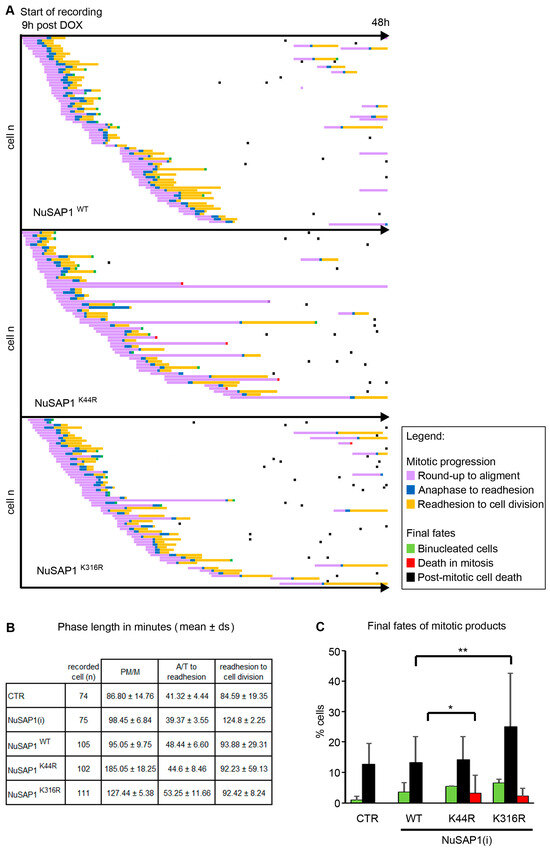 The distinct localization of NuSAP1 mutants may yield different functional consequences. As a first approach to verify this, we decided to videorecord cell lines silenced for the endogenous NuSAP1 gene and reconstituted with NuSAP1WT, NuSAP1K44R and NuSAP1K316 in time-lapse experiments to follow up mitotic and post-mitotic cell fates. Analysis of the videos considered every cell that reached round-up during the recording time (48 h from the moment of dox administration), which was followed up throughout the duration of the video. Examples of the videos obtained from these experiments are shown in Figure S4. Figure 5A shows the results of a representative experiment, in which single cells from each cell line are arranged according to their timing of mitotic entry (round-up) and changes are plotted over time (48 h). NuSAP1WT cultures entered mitosis, progressed to align chromosomes and divided with a similar timing to that of cultures treated with neutral siRNA (Figure 5B). Some cells re-entered a second mitotic round and progressed normally during the remainder of the video. NuSAP1K44R-expressing cultures showed instead a significantly prolonged duration from round-up to alignment (Figure 5A). In some cells, the length of that window occupied most of the video, such that very few cells re-entered a second mitotic round. In some cases, cell death was induced during prolonged prometaphase (an example of mitotic cell death during mitotic delay is shown in Figure S4, and the frequency of these events is represented by red squares in Figure 5A). In parallel, we fixed and stained cell samples in order to analyze mitotic figures in higher resolution. We detected chromosome misalignment in about 20% of NuSAP1K44R metaphases; past that stage, chromosome mis-segregation fell below 7% of late mitotic cells (Figure 6A). These data suggest that NuSAP1K44R-induced defects were sensed by the SAC, resulting either in defect correction or in cell death induction during mitotic delay.