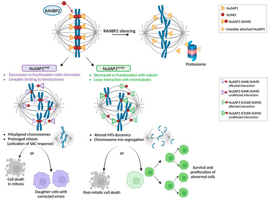 NuSAP1 mutants reveal distinct mitotic functions of NuSAP1. The model proposes that RANBP2 stabilizes NuSAP1 levels and NuSAP1-SUMO2/3 interactions with microtubules and kinetochores. Below, the mutations of K44 in the SAP domain and of K316 in the microtubule-binding domain destabilize specific sets of NuSAP1 interactions, i.e., with kinetochores, and with microtubules, respectively, and hence generate distinct mitotic defects that evolve into different cell fates of mitotic products. The model was created using BioRender.com.