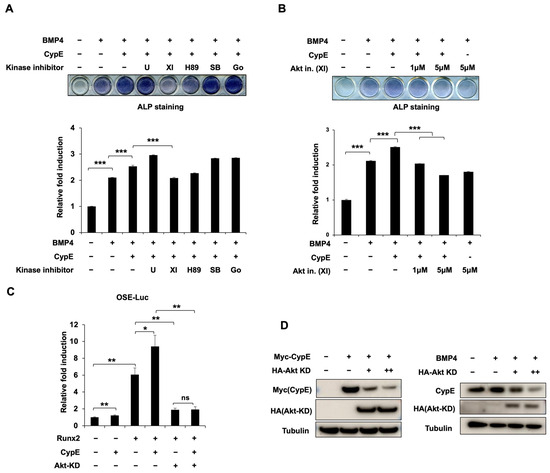Various signaling pathways have important roles during osteoblast differentiation, including p38 MAPK [26], Akt [27], Wnt/β-catenin [28], etc. To examine which signaling pathway is involved in CypE-mediated osteoblast differentiation, we treated cells with various kinase inhibitors after CypE transfection. Among these kinase inhibitors, the Akt signaling inhibitor (XI) dramatically suppressed CypE-induced osteoblast differentiation (Figure 6A,B). To further elucidate the effects of Akt signaling on CypE-regulated osteoblast differentiation, we conducted additional experiments using a kinase-defective mutant form of Akt (Akt-KD). Akt-KD abolished the CypE-induced transcriptional activity of Runx2 (Figure 6C). Furthermore, Akt-KD also decreased the protein levels of exogenous and endogenous CypE (Figure 6D). These results suggest the Akt signaling pathway is involved in CypE-regulated osteoblast differentiation.