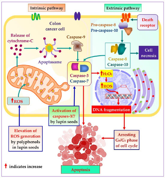 Mazumder, K.; Aktar, A.; Ramasamy, S.; Biswas, B.; Kerr, P.G.; Blanchard, C. Attenuating Colorectal Cancer Using Nine Cultivars of Australian Lupin Seeds: Apoptosis Induction Triggered by Mitochondrial Reactive Oxygen Species Generation and Caspases-3/7 Activation. Cells 2023, 12, 2557. https://doi.org/10.3390/cells12212557