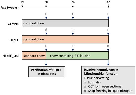 Study design. A total number of 34 ZSF1 female rats was included. At the age of 20 weeks, echocardiography was performed to confirm the development of HFpEF in the ZSF1 obese animals. Thereafter, the ZSF1-obese animals were randomized either into a placebo group (HFpEF n = 12, standard chow) or a treatment group (HFpEF_Leu n = 12, standard chow enriched with 3% leucine). ZSF1-lean animals served as a healthy control group receiving standard chow (Control, n = 10). Follow-up and final echocardiography were performed at the age of 24 and 32 weeks, respectively. Left ventricular hemodynamics were measured prior to organ harvest. The myocardium and other organs were collected for histological and molecular analyses. E = echocardiography.