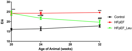 Time course of diastolic function showing a decreased E/é ratio after 4 and 12 weeks of leucine supplementation. *** p < 0.001 vs. Control and ## p < 0.005 and ### p < 0.001 vs. HFpEF.
