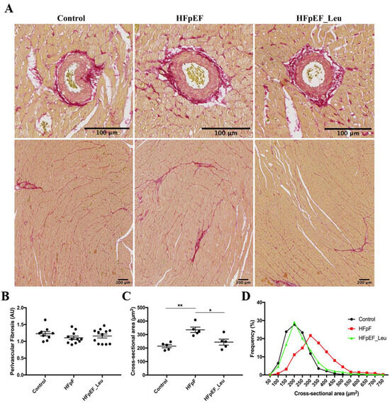 Impact of leucine supplementation on myocardial fibrosis and fiber size. Representative picrosirius staining photomicrographs in LV (A). Perivascular fibrosis was comparable between all groups (B). Fiber cross-sectional areas were significantly increased in HFpEF and reduced in HFpEF_Leu (C). The fiber CSA distribution of control, HFpEF, and HFpEF_Leu indicated a high frequency of large fibers in HFpEF, while HFpEF_Leu fiber size is comparable to the control (D). * p < 0.05 and ** p < 0.005.