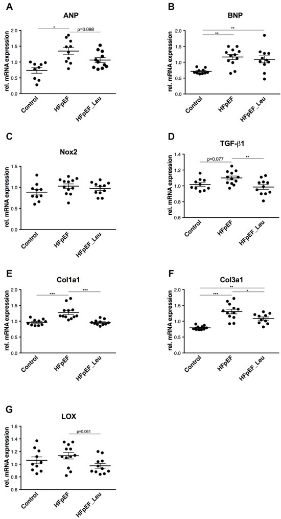 Compared to the control, the expression of ANP mRNA was upregulated in HFpEF and tendentially reduced in HFpEF_Leu (p = 0.098, Figure 4A). BNP mRNA levels were upregulated in both HFpEF groups (Figure 4B). The expressions of Nox2 were comparable between all groups (Figure 4C).