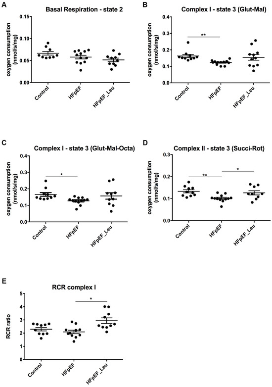 Basal respiration (only substrate and no ADP added, state 2) did not differ between all three groups (Control: 0.066 ± 0.004 nmol/s/mg, HFpEF: 0.057 ± 0.004 nmol/s/mg and HFpEF_Leu: 0.051 ± 0.004 nmol/s/mg, n.s., Figure 5A). Measurement of complex I state 3 (glutamate/malate) showed a significantly decreased respiration rate in HFpEF compared to the control (Control: 0.163 ± 0.009 nmol/s/mg, HFpEF: 0.123 ± 0.003 nmol/s/mg and HFpEF_Leu: 0.154 ± 0.017 nmol/s/mg, ** p < 0.005 vs. Control, Figure 5B); likewise, the same effect was observed following the addition of octanoyl-carnitine (Control: 0.165 ± 0.011 nmol/s/mg, HFpEF: 0.127 ± 0.006 nmol/s/mg and HFpEF_Leu: 0.156 ± 0.019 nmol/s/mg, * p < 0.05 vs. Control, Figure 5C).