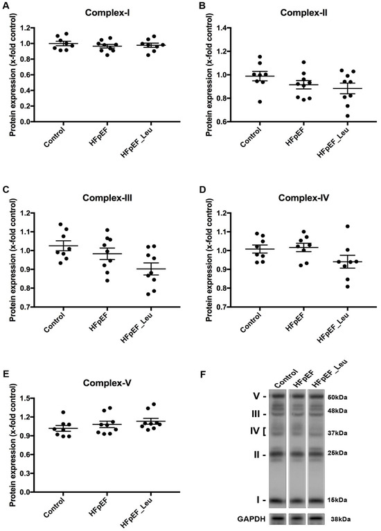 Effect of leucine supplementation on cardiac mitochondrial complex protein expression of HFpEF animals. Protein levels of complex I (A), II (B), III (C), IV (D), and V (E) were unaltered between all groups. A representative Western blot is depicted (F).