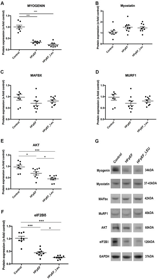 Impact of leucine supplementation on the left ventricular protein turnover. Protein levels of myogenin (A) were decreased in both HFpEF and HFpEF_Leu. Myostatin (B), MAFbx (C), and MuRF1 (D) were unaltered between all groups. Protein levels of AKT (E) and eIF2Bδ (F) were decreased in both HFpEF and HFpEF_Leu. Representative Western blots are depicted (G). * p < 0.05 and *** p < 0.001.