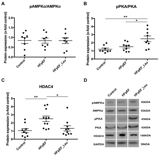 Effect of leucine supplementation on HDAC4 expression and upstream kinases. Protein levels of 5’ AMP-activated protein kinase alfa (AMPKα), (A) were unaltered between groups. Protein kinase A (PKA) (B) protein levels were increased in HFpEF_Leu, while histone deacetylase 4 (HDAC4) (C) was decreased in the same group. Representative bands are depicted (D). * p < 0.05 and ** p < 0.005.