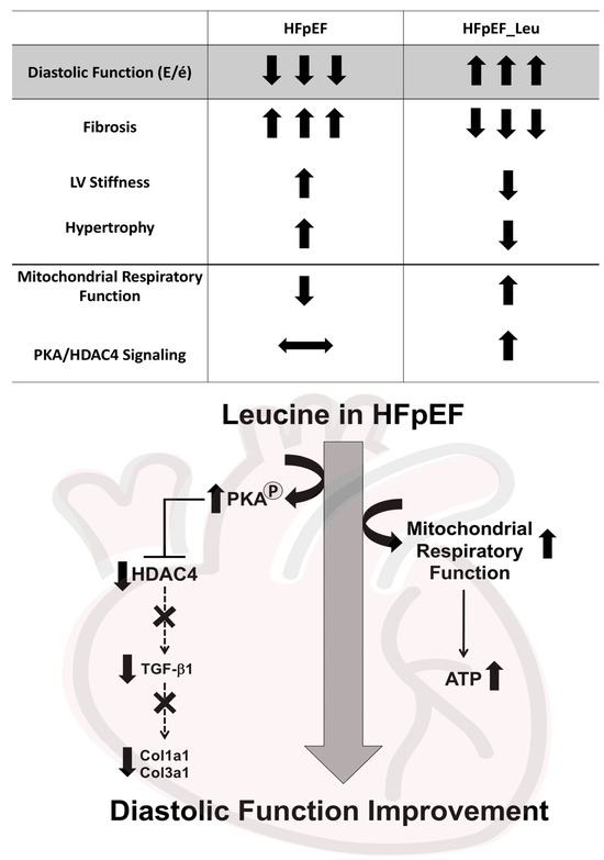 It is important to highlight that leucine supplementation improved diastolic function and was accompanied by reduced cardiac remodeling, indicating that an established HFpEF responds to the supplementary treatment. Since most patients are diagnosed after the disease has already developed, these findings encourage the use of leucine as a potential therapeutic treatment for HFpEF.
