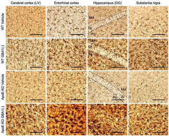 3.2. Loss of ApoE Amplified Brain Regional Microgliosis in Response to GBA1 Inhibition