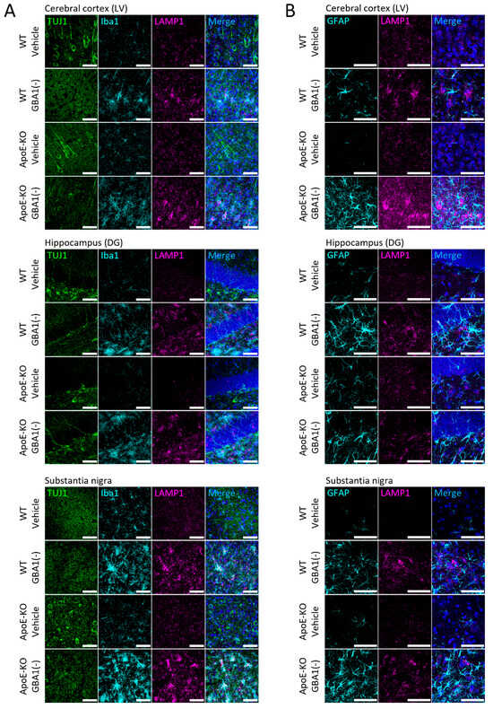 3.4. Loss of ApoE Increased LAMP1 Lysosomal Labeling Associated with Microglia after GBA1 Inhibition
