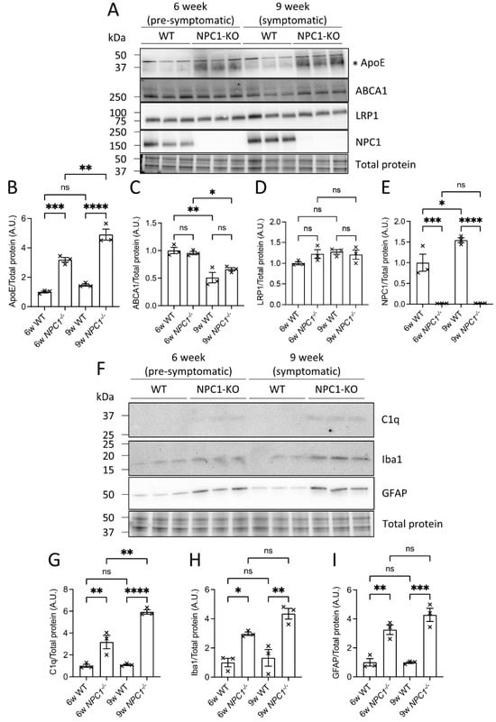3.7. ApoE and Complement Factor C1q Protein Levels Were Elevated in the Brains of NPC1−/− Mice