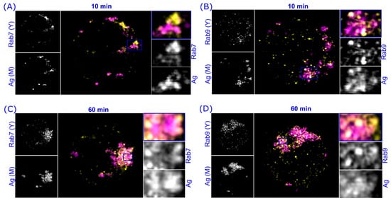 In our previous work, we revealed the heterogenous colocalization of antigen with several endosomal vesicular markers at varying levels at different time points and subcellular locations []. With the aim of better understanding the regulation of antigen migration and targeting to the perinuclear MIIC, we focused on the two late endosomal trafficking proteins Rab7 and Rab9, that both show colocalization with antigen vesicles. We first wanted to verify the accumulation of Rab7 and Rab9 with an internalized antigen in primary B cells, as the antigen vesicle transport has previously been mostly studied in B cell lines. Due to the small size of the primary B cells, around 5 µm in diameter, the imaging of the small subcellar structures like endosomes is particularly challenging in them. To overcome this, we utilized the super-resolution imaging method structured illumination microscopy (SIM) and isolated the splenic B cells from the MD4 mouse strain where B cells express relatively high and homogenous levels of IgM BCR. We inspected the localization of endogenous Rab7 and Rab9 to visualize in higher detail how these late endosomal proteins accumulate with internalized antigen and the perinuclear antigen cluster over time. We activated the MD4 primary B cells for 10 or 60 min with fluorescent AlexaFluor647-labelled α-IgM antibody F(ab’)2 fragments (α-IgM-647) as surrogate antigen, proceeded for immunostainings with Rab7 or Rab9, and imaged the cells with SIM. With this approach, we were able to visualize the Rab7 and Rab9 vesicle pools in relation to antigen and detected the quite different organization of these two markers. While Rab7 appeared more concentrated on antigen both at early (10 min) and late (60 min) time points, Rab9 showed a more scattered pattern throughout the cells and more punctate colocalization with antigen (Figure 1). Upon antigen clustering to the perinuclear region in 60 min, both Rab7 and Rab9 showed the overall enrichment at the antigen-rich areas. However, Rab7 accumulated more clearly to the dense antigen cluster (Figure 1C), whereas Rab9 remained somewhat more dispersed (Figure 1D). This was also seen in the quantification where the overlap between Rab9 and Ag dropped in the 60 min time point compared to 10 min. The overlap between Rab7 and Ag stayed unchanged between 10 and 60 min (Figure S1A). This finding prompted a question of whether Rab7 and Rab9 decorated the same vesicles and co-operated in antigen processing, or whether they define different sets of vesicles and trafficking.