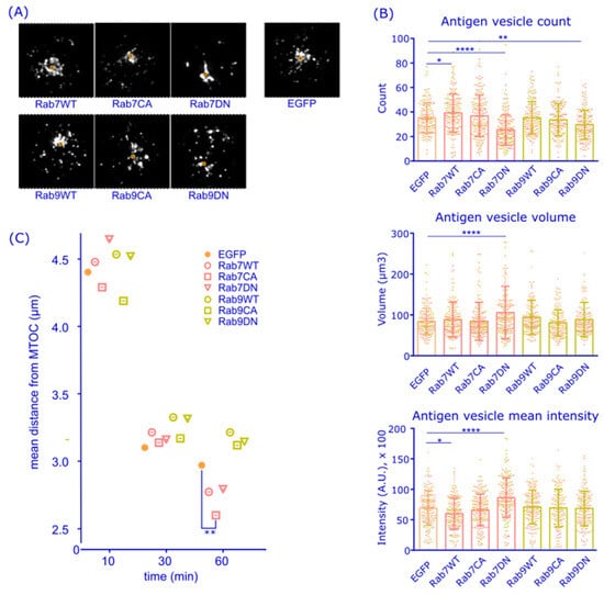 Next, we questioned whether Rab7 and Rab9 activity is required for antigen trafficking to the perinuclear MIIC. We utilized commonly used constitutively active (CA) and dominant negative (DN) point mutations of Rab-family GTPases that are expected to lock the proteins in GTP- or GDP-bound states, respectively [,,]. We transiently expressed different EGFP-tagged versions of Rab7 or Rab9, or EGFP only, in A20D1.3 B cells. The cells were activated with fluorescent α-IgM for 60 min and subjected to immunofluorescence analysis including staining for the microtubule organization center (MTOC) (Figure 3A). We run a detailed analysis of the antigen vesicle properties and intracellular distribution (Supplementary Figure S2A) in all the over-expression conditions. Particle analysis showed that particularly cells expressing Rab7DN, but also those expressing Rab9DN, featured reduced numbers of antigen vesicles than control cells (Figure 3B). The expression of Rab7DN also led to enlarged antigen vesicle volumes and increased vesicle brightness. The overexpression of Rab7WT led to the opposite features, namely increased numbers of antigen vesicles with reduced brightness. On the other hand, none of the constructs induced detectable changes in the total antigen fluorescence intensities, as measured by microscopy (Supplementary Figure S2B) or in the overall capability to internalize antigen, as studied by flow cytometer (Supplementary Figure S3A). We then decided to concentrate on the migration of the largest 10% of the antigen vesicles, as the smaller vesicles are often retained in the cell periphery while the larger ones are found close to the MTOC []. Thus, we examined the distance of the largest 10% of antigen vesicles from the MTOC over time. We noticed that, 60 min after the activation, Rab7CA-expressing cells showed a significantly tighter accumulation of the antigen vesicles towards the MTOC as compared to control cells (2.6 µm vs. 3.0 µm, respectively) (Figure 3C). To illustrate the vesicle distribution better, we plotted the distance distributions of the largest 10% of the antigen vesicles 60 min after activation (Supplementary Figure S2C). Rab7CA-expressing cells featured 48% of the large antigen vesicles within a distance of 2 µm from the MTOC, whereas in control cells, the corresponding portion was 40%. Together, these findings promote the role of Rab7 over Rab9 in antigen trafficking to the perinuclear region.