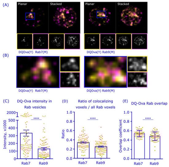 In addition to the influence of Rab7 constructs in antigen vesicle positioning, we saw a significant increase in antigen intensity in cells expressing Rab7DN (Figure 3B). This provoked us to further study antigen processing or degradation capacity in vesicles positive for Rab7 or Rab9 in non-transfected cells. To this end, we utilized a degradation-sensitive probe DQ-Ovalbumin (DQ-Ova). DQ-Ova becomes fluorescent only when its folded three-dimensional structure, that keeps the BODIPY fluorophores quenched, is lost []. In this assay, we activated the B cells with biotin-linked antigen hen egg lysozyme (HEL), that is specific for the D1.3 IgM receptor, sandwiched to the biotinylated DQ-Ova via streptavidin. After 60 min of activation, cells were fixed, immunostained for endogenous Rab7 or Rab9, and imaged in 3D with SDCM (Figure 4A). We measured the intensity of the DQ-Ova signal in Rab7+ and Rab9+ vesicles by performing particle analysis on the images. The data revealed almost three times higher levels of the DQ-Ova signal in Rab7+ vesicles as compared to Rab9+ vesicles (Figure 4C). In line with this, the analysis of the ratio of the Rab-colocalizing DQ-Ova voxels to all Rab voxels reported a higher proportion Rab7 than with Rab9 in compartments of Ag degradation (0.34 vs. 0.25; Figure 4D) and the overlap coefficients of the DQ-Ova signal were also significantly higher with Rab7 than with Rab9 (0.54 vs. 0.48; Figure 4E).