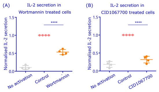 A20 D1.3 cells were incubated with 5 µg/mL of HEL for 1 h at 37 °C in cRPMI. After 1 h, cells were washed and resuspended in cRPMI. Activated B cells were mixed with 1E5 T cells (ratio 2:1) and placed in 5% CO2 at 37 °C for 17 h. Then, 1 µM Wortmannin (SigmaAldrich, W1628) was added for the time of B cell activation only and the samples were washed before adding the T cells. Moreover, 60 µM CID1067700 (Merck, #SML0545) [] was added for the full course of the experiment due to the fast reversible nature of the drug. Secretion of IL-2 was measured with ELISA. The 96-well ELISA plates (Microlon 600, Bio-One 675061) were coated with anti-IL-2 for 1 h at 37 °C in 25 µL of PBS. Non-specific binding sites were blocked with blocking buffer (1% BSA-PBS) at 4 °C overnight. Additionally, 50 µL of the co-culture supernatant was added to each well for 1 h at 37 °C and 50 µL of biotin-conjugated anti-IL-2 was added on the plate for 1 h at RT. Finally, blocking buffer containing ExtrAvidin Alkaline Phosphatase (1:5000, Sigma-Aldrich, 043M4771) was added and the plate was incubated 1 h at RT. Plates were washed with 0.05% Tween-20–PBS between the steps. Finally, the wells were supplemented with 50 µL of pNPP (SIGMAFAST p-Nitrophenyl phosphatase tablets, Sigma-Aldrich®, N2770) and the optical density was measured at 405 nm (Multiscan, Thermo Scientific, SkanIt Software, vs. 3.1.0.4). Samples were run in triplicates. All the samples were normalized to the control samples.