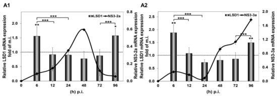 HCV-mediated regulation of LSD1 mRNA in Huh7.5 cells. The histograms depict relative LSD1 (bars) and HCV NS3 (black line) mRNA expression during infection with HCV-2a (A1) and HCV-3a (A2) laboratory clones, compared to mock infection. Total RNA was extracted from Huh7.5 cells and subjected to RT-qPCR. 18S rRNA was used as an internal control. Values were calculated as fold of the respective mock-infected controls that were arbitrarily set as 1 (represented by the dashed line). (* p-value ≤ 0.05, ** p-value ≤ 0.005, *** p-value ≤ 0.005).