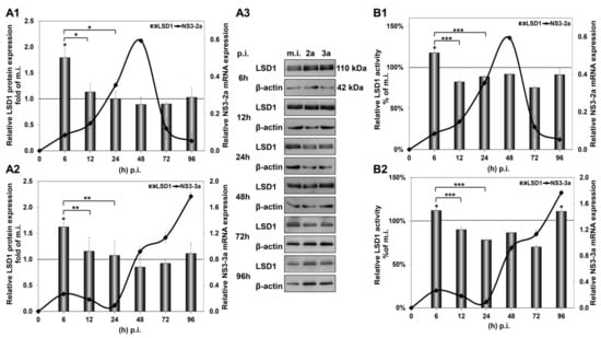 The significant increase in LSD1 mRNA at 6 h p.i. was accompanied by a similar increase in LSD1 protein expression, shown in Figure 2(A1,A2), that was not observed in mock-infected cells (Figure S1B). Importantly, LSD1 enzymatic activity was also found to be increased by 20% at the same time point, shown in Figure 2(B1,B2), when constitutive LSD1 activity was observed to be down-regulated by at least 50% from 24 h to 96 h in comparison with the 6 h mock-infected control (Figure S1C). Interestingly, protein expression was maintained at background levels until 96 h p.i., despite the increase in mRNA observed at the same time point.