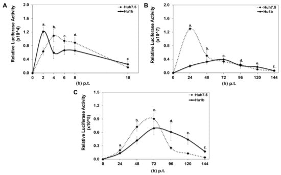 Schematic representation of HCV genome constructs used for electroporation of Huh7.5 and Hu1b cell lines, as described in Section 2.3. (A) Replication-deficient HCV replicon, ΔGND; (B) replication-efficient HCV replicon, pFK-I389PI-Luc/NS3-3′/JFH1; and (C) full HCV genome, JcR-2a.