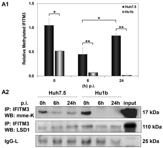 LSD1 activates IFITM3 via regulation of its monomethylation status in HCV infection. (A1) The graph depicts the relative expression of mme-K IFITM3 (ratio of mme-K IFITM3 over IgG-L expression), which represents the inactive fraction of the IFITM3 protein, after HCV-3a infection of Huh7.5 and Hu1b cell lines. (A2) Representative Western blot image of whole cell extracts from HCV-3a-infected Huh7.5 and Hu1b cells co-immunoprecipitated with total IFITM3 and immunoblotted with mme-K and LSD1 antibodies. The blot was subjected to densitometry and plotted in expression histograms, as shown in (A1). IgG-L was used as loading control. (* p-value ≤ 0.05, ** p-value ≤ 0.005).