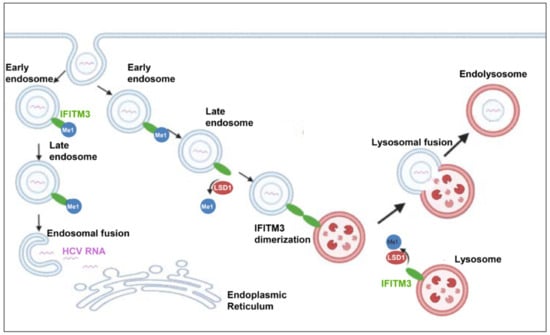 Different studies have revealed a variety of endocytic routes for HCV enveloped viral capsids. Following receptor-mediated endocytosis, the viral particles are internalised in a clathrin-mediated way into endosomes, where pH triggers fusion between the viral envelope and endosomal membranes [39]. In order to study whether endocytosis was involved in LSD1-mediated inhibition of HCV propagation, we focused on the endolysosomal protein IFITM3. IFITM3 was up-regulated during the early hours (6 h p.i.) of HCV infection both in overexpressed and normal endogenous LSD1 levels, which suggests that IFITM3 functions as part of the IFN-induced host cell immune response against virus entry. Remarkably, as infection progressed (24 h p.i.), IFITM3 remained increased only in LSD1-overexpressing cells. We realised that in the presence of the virus, LSD1 overexpression strongly demethylated IFITM3, thereby increasing its active form, forcing the shutdown of HCV propagation. Otherwise, upon normal LSD1 endogenous levels, the virus was able to overcome the IFN-LSD1-IFITM3 axis, so that HCV RNA could be released from late endosomes escaping lysosomal degradation, as previously shown [83,84]. This proposed mechanism is schematically illustrated in Figure 11. IFITM3 has been characterised as an antiviral agent against numerous enveloped RNA viral pathogens, particularly those who enter cells through endocytosis, such as IAV and dengue (DENV). However, emerging viruses, like the Zika virus (ZIKV), still need to adapt against this immune response mechanism [85,86].