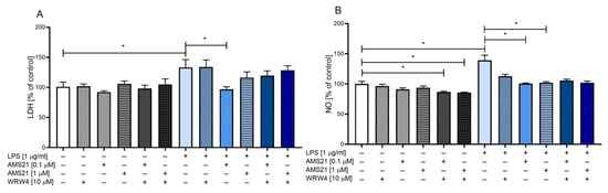 The effect of WRW4 and AMS21 treatment on lactate dehydrogenase (LDH) (A) and nitric oxide (NO) (B) release in LPS-stimulated OHCs. Cultures were pre-treated with the FPR2 antagonist WRW4 (10 μM) for 30 min. Afterwards, OHCs were treated with two doses of AMS21 (0.1 μM and 1 μM) for one hour and then stimulated with lipopolysaccharide (LPS; 1 μg/mL) for 24 h. Control groups were treated with an appropriate vehicle. The data are presented as the mean percentage ± SEM of the control of independent experiments, n = 4–6 in each experiment. Statistical analysis was carried out using two-way analysis of variance (ANOVA) with the Duncan post hoc test to assess the differences between the treatment groups. Significant differences are indicated by * p < 0.05. LDH—lactate dehydrogenase; NO—nitric oxide; LPS—lipopolysaccharide.