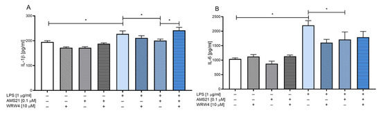 The impact of WRW4 and AMS21 on the release of proinflammatory IL-1β (A) and IL-6 (B) cytokines in LPS-stimulated OHCs. Cultures were pre-treated with the FPR2 antagonist WRW4 (10 μM) for 30 min. Afterwards, OHCs were stimulated with AMS21 (0.1 μM) for one hour and then with lipopolysaccharide (LPS; 1 μg/mL) for 24 h. Control groups were treated with the appropriate vehicle. The data are presented as the mean ± SEM of independent experiments, n = 4–8 in each experiment. Statistical analysis was carried out using two-way analysis of variance (ANOVA) with the Duncan post hoc test to assess the differences between the treatment groups. Significant differences are indicated by * p < 0.05. IL-1β—interleukin 1β; IL-6—interleukin 6; LPS—lipopolysaccharide.