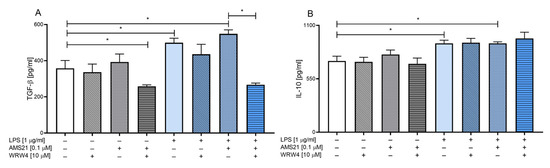 The impact of WRW4 and AMS21 on the release of anti-inflammatory TGF-β (A) and IL-10 (B) cytokines in LPS-stimulated OHCs. Cultures were pre-treated with the FPR2 antagonist WRW4 (10 μM) for 30 min. Afterwards, OHCs were stimulated with AMS21 (0.1 μM) for one hour and then with lipopolysaccharide (LPS; 1 μg/mL) for 24 h. Control groups were treated with the appropriate vehicle. The data are presented as the mean ± SEM of independent experiments, n = 4–8 in each experiment. Statistical analysis was carried out using two-way analysis of variance (ANOVA) with the Duncan post hoc test to assess the differences between the treatment groups. Significant differences are indicated by * p < 0.05. TGF-β—transforming growth factor β; IL-10—interleukin 10; LPS—lipopolysaccharide.