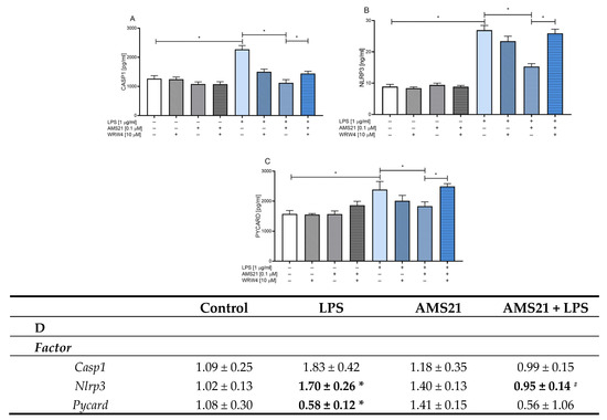The impact of WRW4 and AMS21 on the protein levels of CASP1 (A), NLRP3 (B), and PYCARD (C) and mRNA expression (D) in LPS-stimulated OHCs. Cultures were pre-treated with WRW4 (10 μM) for 30 min. Afterwards, OHCs were administered AMS21 (0.1 μM) for one hour and lipopolysaccharide (LPS; 1 μg/mL) for 24 h. Control groups were treated with the appropriate vehicle. The data are presented as the mean ± SEM of independent experiments (A–C), n = 6–8 in each experiment and as the average fold change ± SEM (D), n = 3–6 in each experiment. Statistical analysis was carried out using two-way analysis of variance (ANOVA) with the Duncan post hoc test to assess the differences between the treatment groups. Significant differences are indicated by * p < 0.05 (A–C), and * p < 0.05 control compared to the LPS group; # p < 0.05 LPS compared to the AMS21 + LPS group (D). CASP1—caspase 1; NLRP3—nod-like receptor pyrins 3; PYCARD—apoptosis-associated speck-like protein containing a caspase recruitment domain; LPS—lipopolysaccharide.