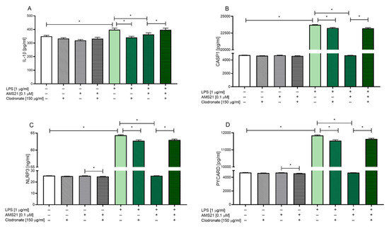 The impact of clodronate and AMS21 on the protein levels of IL-1β (A), CASP1 (B), NLRP3 (C), and PYCARD (D) in LPS-stimulated OHCs. Microglia depletion was performed on the 1st DIV using clodronate (150 μg/mL). On the 7th DIV, cultures were stimulated with AMS21 (0.1 μM) for one hour and then with lipopolysaccharide (LPS; 1 μg/mL) for 24 h. Control groups were treated with the appropriate vehicle. The data are presented as the mean ± SEM of independent experiments, n = 7–8 in each experiment. Statistical analysis was carried out using two-way analysis of variance (ANOVA) with the Duncan post hoc test to assess the differences between the treatment groups. Significant differences are indicated by * p < 0.05. CASP1—caspase 1; NLRP3—nod-like receptor pyrins—3; PYCARD—apoptosis-associated speck-like protein containing a caspase recruitment domain (CARD); LPS—lipopolysaccharide.