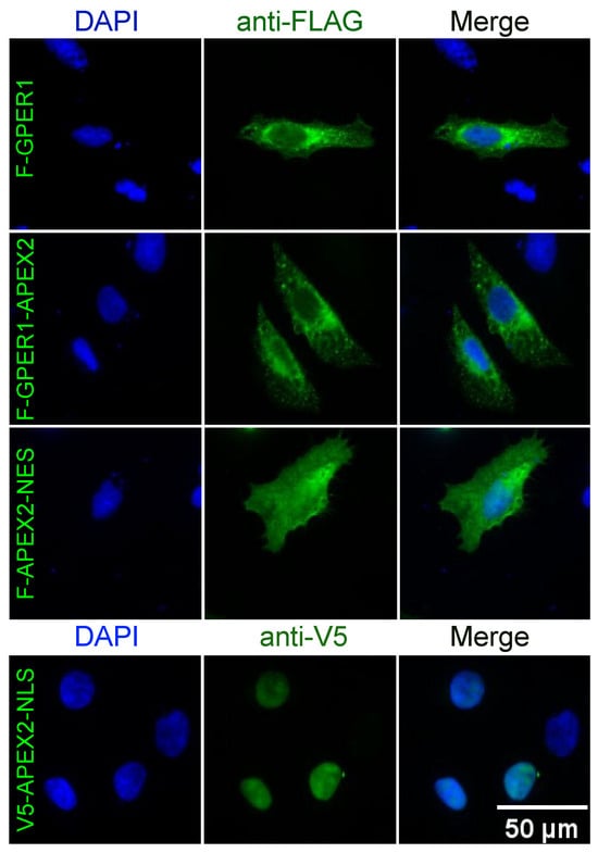 In view of using the proximity labeling system with APEX2 [,,], an improved version of ascorbate peroxidase, its impact on GPER1 localization and function needed to be evaluated. To verify that the fusion of APEX2 to the C-terminus of GPER1 did not change its subcellular localization, we performed an immunofluorescence (IF) experiment with transfected HeLa cells. We exogenously expressed F-GPER1, the F-GPER1-APEX2 fusion protein, and, for comparison, FLAG-tagged APEX2 with a nuclear export signal (F-APEX2-NES) and V5-tagged APEX2 with a nuclear localization signal (V5-APEX2-NLS). Using an anti-FLAG antibody, IF images showed the same localization for F-GPER1 and F-GPER1-APEX2. Our images are compatible with the previously reported localization of GPER1 to the membrane of the endoplasmic reticulum []. As expected, F-APEX2-NES and V5-APEX2-NLS displayed diffuse cytoplasmic and nuclear staining, respectively (Figure 1).