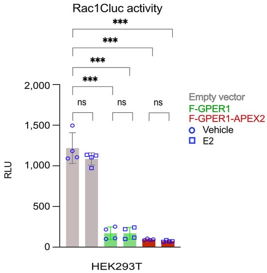 To confirm that the fusion of APEX2 to the C-terminus of FLAG-tagged GPER1 (F-GPER1-APEX2) did not change GPER1 activity, we used a split click-beetle luciferase-based Rac1 sensor as a proxy of GPER1-mediated activation of phosphoinositide 3-kinase and its downstream effector Rac1. The readout with the Rac1 sensor encoded by plasmid Rac1Cluc is based on a conformational change of the hybrid protein, which allows the intramolecular reconstitution of a functional luciferase [,] (Figure S1B,C). HEK293T cells transiently expressing either F-GPER1 or F-GPER1-APEX2 displayed constitutively decreased luminescence compared to cells transfected with an empty expression vector as negative control. Surprisingly, the luminescence did not change significantly upon the addition of 100 nM E2 (Figure 2). Our results agree with the aforementioned report indicating constitutive activity for GPER1 [] and suggest that the fusion of APEX2 to the C-terminus of GPER1 may not perturb its activity.