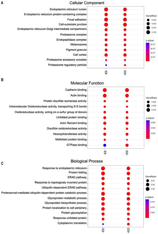 GO analysis of the proximity labeling–LC-MS/MS data. GO term enrichment analyses of terms associated with “Cellular Component” (A), “Molecular Function” (B), and “Biological Process” (C). The color scale on the right indicates q-values (adjusted p-values). GeneRatio (and the size of the colored dots) indicates the fraction of enriched proteins relative to all proteins associated with the indicated GO term; ERAD, endoplasmic reticulum-associated degradation.