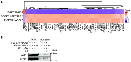 Enrichment pattern of some of the proximity labeling–LC-MS/MS data and validation of IKBIP and LAMB1 as GPER1-proximal proteins. (A) Hierarchically clustered heat map illustrating the enrichment of certain biotinylated proteins in the presence of the APEX2 fusion proteins and E2 as indicated on the left. For this illustration, only proteins corresponding to some of the highlighted GO terms (specifically: ERAD pathway, proteasome complex, protein glycosylation, cadherin binding, focal adhesion, endoplasmic reticulum–Golgi intermediate compartment) were selected. The heat map was generated with the average Log2 LFQ intensities of 3 biological replicates. (B) Immunoblot analysis of a pull-down of biotinylated proteins for the enriched presence of IKBIP and LAMB1 upon proximity labeling mediated by F-GPER1-APEX2 with and without E2 compared to the negative control protein F-APEX2-NES. LAMB1 and IKBIP1 were revealed with their respective specific antisera. Numbers on the right point out molecular weights of marker proteins close by.