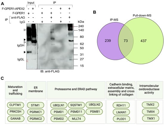IP-LC-MS/MS experiment and data analysis. (A) Quality control experiment for the anti-FLAG IP of proteins associated with F-GPER1-APEX2 and F-GPER1, transiently expressed in HEK293T cells. Mouse IgG antibodies were used as negative control. The open and closed arrowheads on the left point to the bands corresponding to the proteins F-GPER1-APEX2 (see also Figure 3A) and F-GPER1 (as for F-GPER1-APEX2, representing glycosylated forms and/or dimers or hetero-oligomers), respectively. The positions of the heavy (IgGH) and light (IgGL) chains of the antibodies are indicated. (B) Venn diagram of top hits of the IP-LC-MS/MS and proximity labeling–LC-MS/MS experiments. The top hits of the proximity labeling–LC-MS/MS experiment (selected with the same cutoff as for Figure 3B, and essentially corresponding to the ones common to F-GPER-APEX2 without and with E2) were compared to those of the IP-LC-MS/MS experiments (the ones common to F-GPER1 and F-GPER1-APEX2, sorted based on iBAQ score). The sizes of the circles only approximately reflect the number of proteins. (C) Selection of some of the 73 common proteins of panel B in relationship to the GO terms they are associated with. The illustration was created with BioRender.com. ER, endoplasmic reticulum.