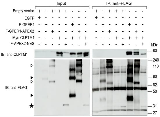 GPER1 interacts with CLPTM1. Co-IP experiment with HEK293T cells transiently expressing indicated proteins. The co-IP was performed with an anti-FLAG antibody, and the immunoblots (IBs) with anti-CLPTM1 or anti-FLAG antibodies. F-APEX2-NES served as negative control. In all cases, two expression vectors were transfected (in some cases one was the empty expression vector), and at least one protein was exogenously expressed (which in some cases was EGFP as negative control). The open and closed arrowheads on the left point to the bands corresponding to the various forms of the proteins F-GPER1-APEX2 and F-GPER1, respectively (see also Figure 3A and Figure 6A). ★, band corresponding to F-APEX2-NES.