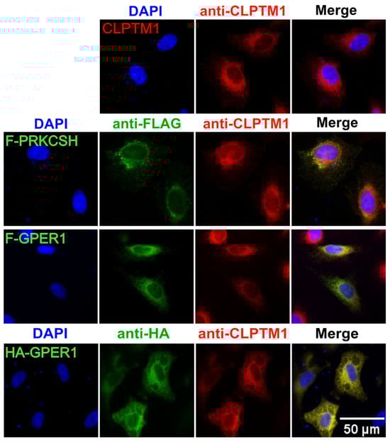 We performed transient transfection experiments with HeLa cells to coexpress various proteins. By IF, we meant to evaluate to what extent we could support our biochemical results by demonstrating colocalization, and whether any of the proteins might affect the localization of another one (Figure 8). The subcellular localization patterns of exogenously expressed tagged GPER1 and F-PRKCSH and endogenous CLPTM1, a multi-transmembrane protein, are compatible with the expected localization to the endoplasmic reticulum, and there, presumably the membrane. In agreement with our results mentioned above, exogenous GPER1, either with a 3xFLAG or HA tag (F-GPER1 and HA-GPER1, respectively), and endogenous CLPTM1 extensively colocalize, whereas exogenous F-PRKCSH at least partially colocalizes with CLPTM1.