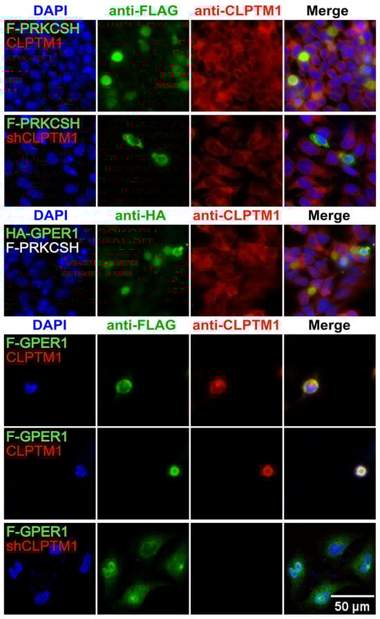 Subcellular localization of GPER1, CLPTM1, and PRKCSH in combination. IF experiment with HeLa cells that were transiently transfected with the indicated plasmids (always mentioned in the first and DAPI-stained image of each row on the far left). shCLPTM1 allows the production of shRNA to knock down endogenous CLPTM1 expression. Note that CLPTM1 written in red indicates exogenous Myc-CLPTM1 and that F-PRKCSH written in white indicates that it was exogenously expressed but not stained for. Moreover, note that there are two rows for the coexpression of F-GPER1 and Myc-CLPTM1. Scale bar = 50 μM.