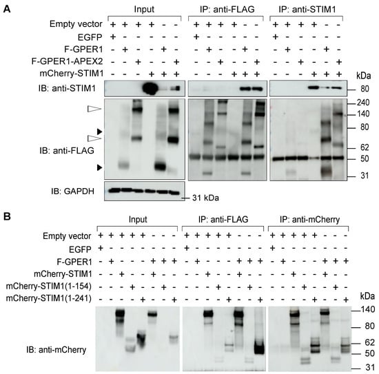 GPER1 interacts with STIM1. (A) Co-IP experiment with HEK293T cells transiently expressing indicated proteins demonstrating that mCherry-STIM1 interacts with both F-GPER1 and F-GPER1-APEX2. The experiment was set up in an analogous way to the co-IP experiment of Figure 7. GAPDH was used as a loading control for the input samples. The open and closed arrowheads on the left point to the bands corresponding to the proteins F-GPER1-APEX2 and F-GPER1, respectively (representing glycosylated forms and/or dimers or hetero-oligomers; see also Figure 6). (B) Co-IP experiment with STIM1 truncation mutants to map STIM1 domain required for interaction.