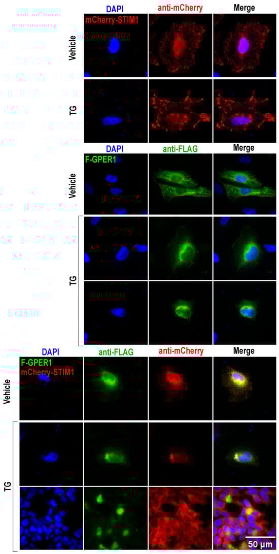 IF imaging of F-GPER1 and mCherry-STIM1, exogenously expressed in HeLa cells, indicates that they may both be primarily localized in the membrane of the endoplasmic reticulum (Figure 11). Upon treating the cells with 1 µM of the ionophore thapsigargin (TG) for 15 min, it seems that F-GPER1 is still associated with the endoplasmic reticulum, whereas mCherry-STIM1 adopts a much more punctiform pattern (Figure 11, second row). This recapitulates what was already known about STIM1, namely that it accumulates in puncta located in the endoplasmic reticulum and at endoplasmic reticulum–plasma membrane junctions upon calcium store depletion [,]. When F-GPER1 and mCherry-STIM1 were coexpressed, they colocalized but seemed to retain the same subcellular localization. In contrast, upon TG treatment, they either colocalized in a perinuclear or, in the case of F-GPER1, even in a nuclear region (Figure 11, bottom rows). As mentioned above for the impact of CLPTM1 on the localization of F-GPER1, here again, it seemed that cells with coexpression of F-GPER1 and mCherry-STIM1 stained more weakly with DAPI, and therefore potentially were in the early stages of apoptosis. Collectively, the biochemical and IF experiments strongly support the conclusion that STIM1 interacts as part of the same complex and that there may be a functional interaction as well.