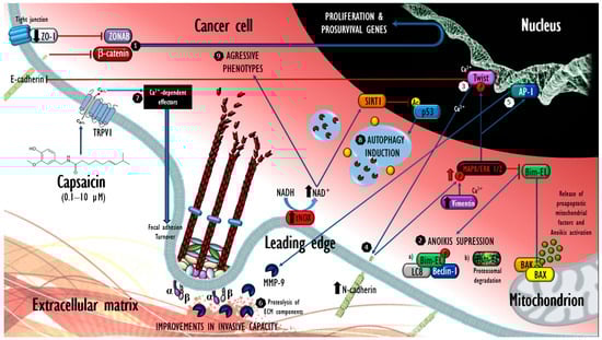 Mechanistic model of the promoter effects observed in cancer cells exposed to 0.1 to 10 µM concentrations of CAP. Improvements in proliferation and invasiveness are produced through the epithelial–mesenchymal transition. (1) After a drop in the expression of ZO-I and E-cadherin, the import of ZONAB and β-catenin to the nucleus occurs, enabling their transcriptional activity on proliferation and survival genes. The increase in MAPK/ERK 1/2 signaling phosphorylates and modulates the activity of three downstream targets, (2) Bim-EL, whose pro-anoikis activity is suppressed by (a) heterotrimer sequestration or (b) proteasomal degradation; in (3) Twist, whose transcriptional regulation would explain both E-cadherin abrogation and (4) N-cadherin overexpression, which, through its intracytoplasmic domain and in conjunction with vimentin, positively feeds back the phosphorylation of MAPK/ERK 1/2 that stimulates the expression of MMP-9 in parallel through the transcriptional activation of the AP-1 heterodimer (5), producing (6) proteolytic effects on the extracellular matrix. (7) Concomitant internalization of Ca2+ enabled by CAP through TRPV1 enables the cell to exhibit a rapid turnover of focal adhesions in favor of a greater invasive capacity. Finally, as a consequence of the increased expression of tNOX, the acquisition of aggressive phenotypes is stimulated (9) and, in the dependent manner of its enzymatic product (NAD+), SIRT1 deacetylates p53 and leads to autophagy (8), guaranteeing the availability of nutrients during the eventual circulatory dissemination of the tumor cell. Ca2+ dependence is noted in some of these events. This figure was devised using BioRender icons (https://biorender.com, accessed on 30 May 2023) and the vector image bank of Servier Medical Art (https://smart.servier.com/, accessed on 30 May 2023). Servier Medical Art by Servier is licensed under a Creative Commons Attribution 3.0 Unported License.